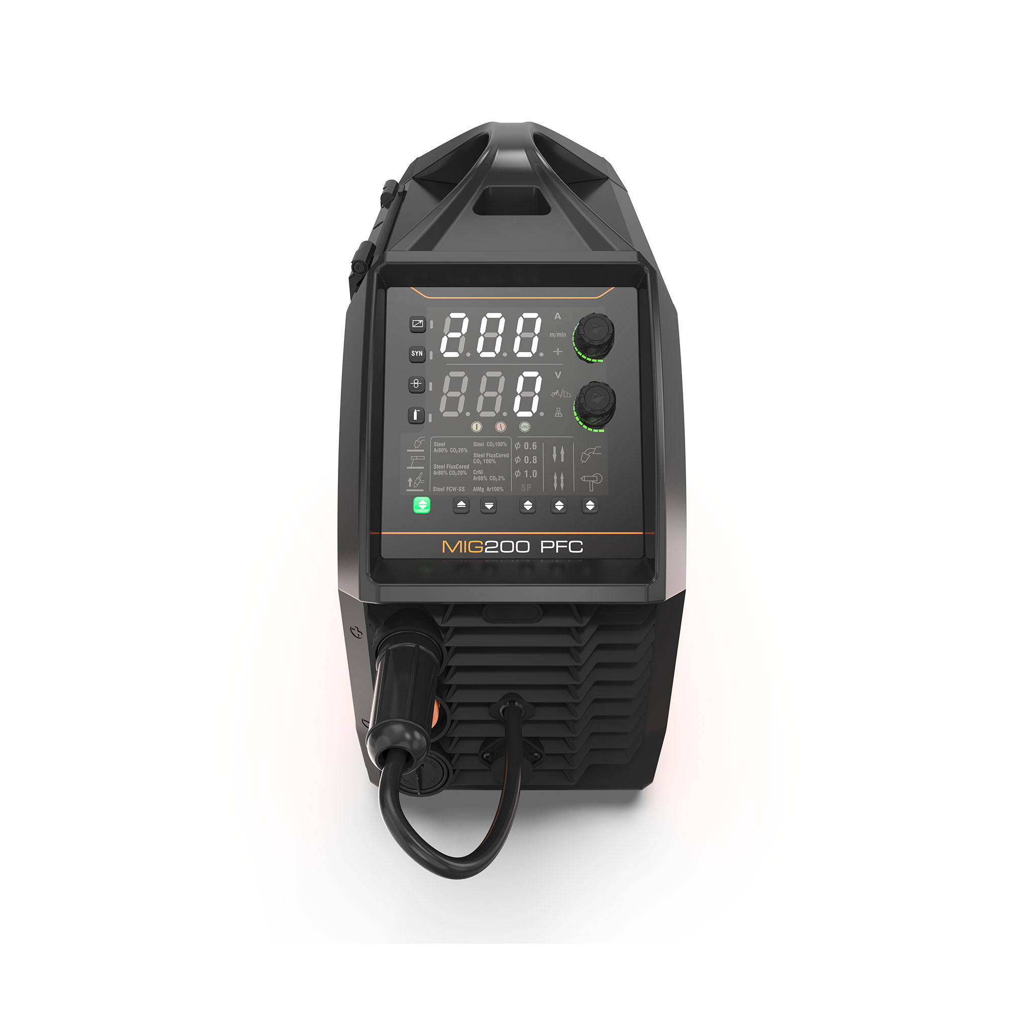 Equipo MIG de 200 A con PFC, ideal para redes inestables y uso profesional.